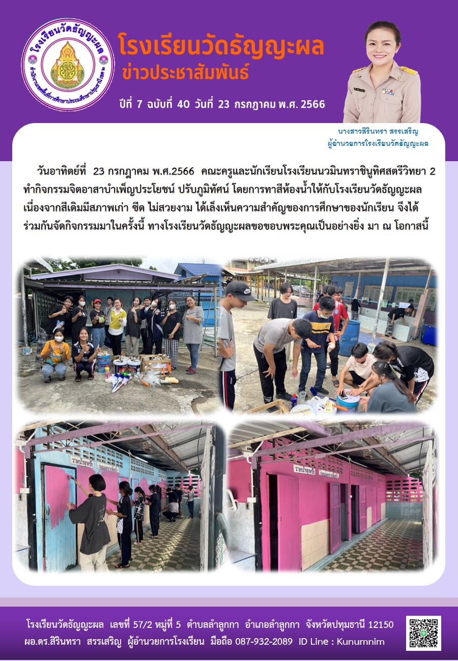 วันอาทิตย์ที่ 23 กรกฎาคม พ.ศ.2566 คณะครูและนักเรียนโรงเรียนนวมินทราชินูทิศสตรีวิทยา 2 ทำกิจกรรมจิตอาสาบำเพ็ญประโยชน์ ปรับภูมิทัศน์ โดยการทาสีห้องน้ำให้กับโรงเรียนวัดธัญญะผล เนื่องจากสีเดิมมีสภาพเก่า ซีด ไม่สวยงาม ได้เล็งเห็นความสำคัญของการศึกษาของนักเรียน จึงได้ร่วมกันจัดกิจกรรมมาในครั้งนี้ ทางโรงเรียนวัดธัญญะผลขอขอบพระคุณเป็นอย่างยิ่ง มา ณ โอกาสนี้