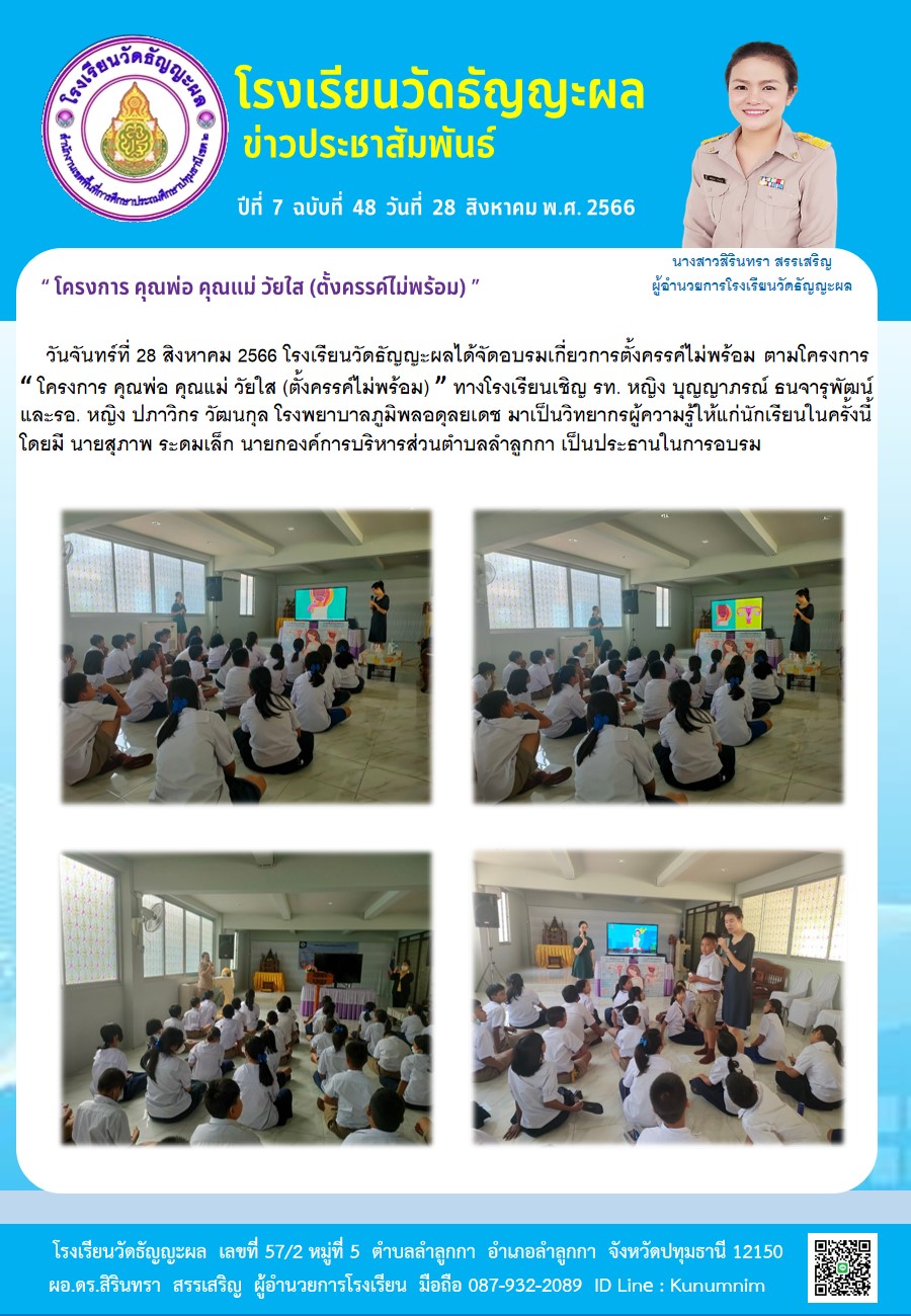 วันจันทร์ที่ 28 สิงหาคม 2566 โรงเรียนวัดธัญญะผลได้จัดอบรมเกี่ยวการตั้งครรค์ไม่พร้อม ตามโครงการ “ โครงการ คุณพ่อ คุณแม่ วัยใส (ตั้งครรค์ไม่พร้อม) ” ทางโรงเรียนเชิญ รท. หญิง บุญญาภรณ์ ธนจารุพัฒน์ และรอ. หญิง ปภาวิกร วัฒนกุล โรงพยาบาลภูมิพลอดุลยเดช มาเป็นวิทยากรผู้ความรู้ให้แก่นักเรียนในครั้งนี้ โดยมี นายสุภาพ ระดมเล็ก นายกองค์การบริหารส่วนตำบลลำลูกกา เป็นประธานในการอบรม