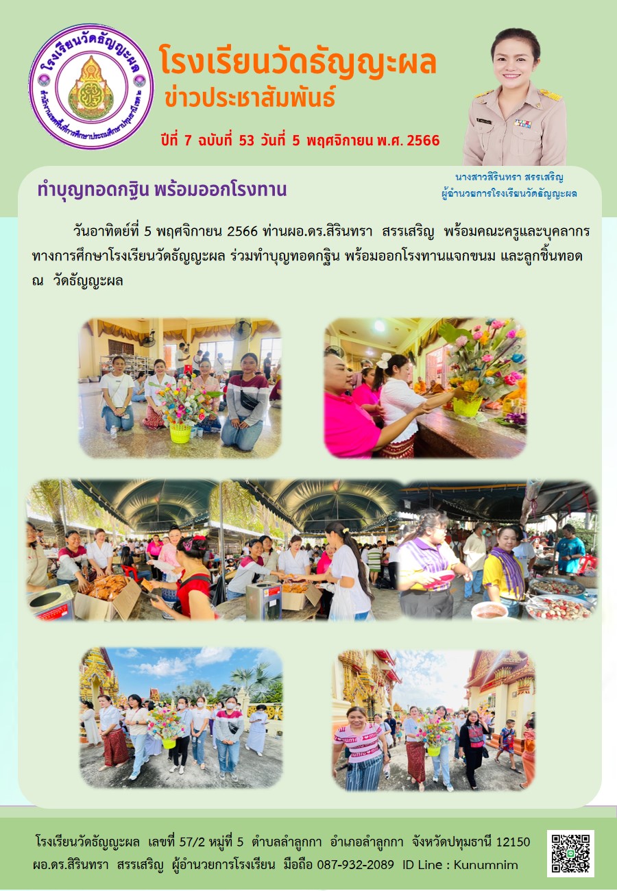 วันอาทิตย์ที่ 5 พฤศจิกายน 2566 ท่านผอ.ดร.สิรินทรา สรรเสริญ พร้อมคณะครูและบุคลากรทางการศึกษาโรงเรียนวัดธัญญะผล ร่วมทำบุญทอดกฐิน พร้อมออกโรงทานแจกขนม และลูกชิ้นทอด ณ วัดธัญญะผล