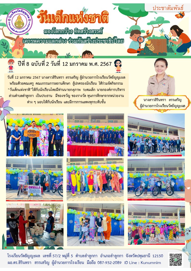 วันที่ 12 มกราคม 2567 นางสาวสิรินทรา สรรเสริญ ผู้อำนวยการโรงเรียนวัดธัญญะผล พร้อมด้วยคณะครู คณะกรรมการสถานศึกษา ผู้ปกครองนักเรียน ได้ร่วมจัดกิจกรรม “วันเด็กแห่งชาติ”ให้กับนักเรียนโดยมีท่านนายกสุภาพ ระดมเล็ก นายกองค์การบริหาร ส่วนตำบลลำลูกกา เป็นประธาน มีของขวัญ ของรางวัล ทุนการศึกษาจากหน่วยงาน ต่าง ๆ มอบให้กับนักเรียน และมีการการแสดงทุกระดับชั้น