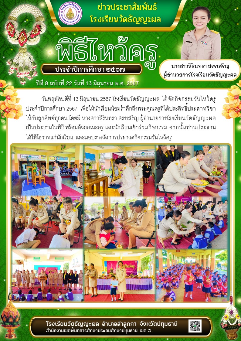 วันพฤหัสบดีที่ 13 มิถุนายน 2567 โรงเรียนวัดธัญญะผล ได้จัดกิจกรรมวันไหว้ครู ประจำปีการศึกษา 2567 เพื่อให้นักเรียนน้อมรำลึกถึงพระคุณครูที่ได้ประสิทธิ์ประสาทวิชาให้กับลูกศิษย์ทุกคน โดยมี นางสาวสิรินทรา สรรเสริญ ผู้อำนวยการโรงเรียนวัดธัญญะผล เป็นประธานในพิธี พร้อมด้วยคณะครู และนักเรียนเข้าร่วมกิจกรรม จากนั้นท่านประธาน ได้ให้โอวาทแก่นักเรียน และมอบรางวัลการประกวดกิจกรรมวันไหว้ครู