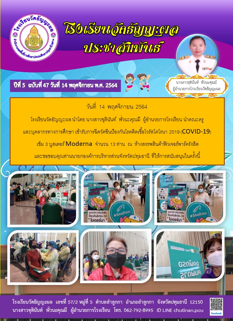 โรงเรียนวัดธัญญะผล นำคณะครูและบุคลากรการศึกษา เข้ารับการฉีดวัคซีนป้องกันโรคติดเชื้อไวรัสโคโรนา 2019 (Covid - 19) เข็ม 3 บูสเตอร์Moderna