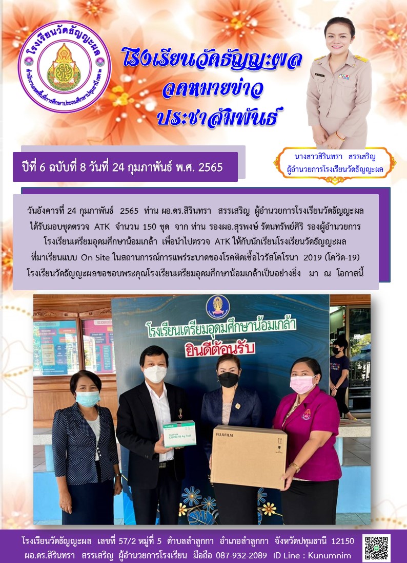วันที่ 24 กุมภาพันธ์ 2565 ท่านผอ.ดร.สิรินทรา สรรเสริญ ผู้อำนวยการโรงเรียนวัดธัญญะผลได้รับมอบชุดตรวจ ATK จำนวน 150 ชุด จาก ท่านรองผอ.สุรพงษ์ รัตนทรัพย์ศิริ รองผู้อำนวยการโรงเรียนเตรียมอุดมศึกษกน้อมเกล้า